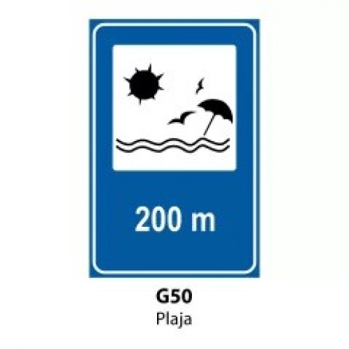 Aceste indicatoare rutiere se întâlnesc în apropierea unei plaje. În cazul de față indicatorul este amplasat la 200 metri de plajă.