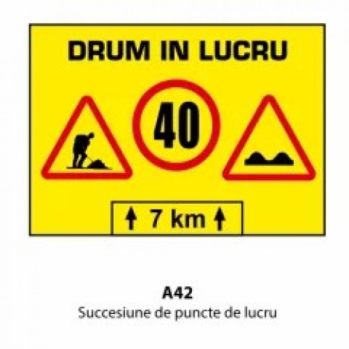 Indicatorul rutier din imaginea alăturată, semnalizează o succesiune de puncte de lucru pe o distanță de 7 kilometri. Conducătorii auto sunt obligați să nu circule cu o viteză mai mare de 40 km/h.